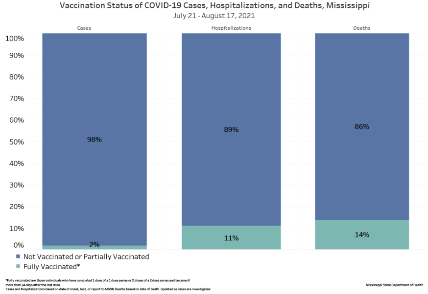In Mississippi, 36% of the population is fully vaccinated against COVID. Between July 24th and Aug. 17th, only 2% of cases, 11% of hospitalizations, and 14% of deaths came from fully vaccinated individuals (see Figure 3 below).