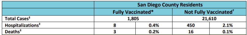 For example, San Diego county has been releasing periodic COVID reports for months. As of Aug. 18th, 72.8% of San Diego Country residents were fully vaccinated. Thus, if vaccines were completely ineffective, we’d expect that around 70% of COVID cases, hospitalizations, and deaths would come from fully vaccinated individuals. However, between the dates of July 12th and Aug. 10th, only 8% of cases, 2% of hospitalizations, and 16% of deaths came from fully vaccinated individuals (see Figure 2 below).
