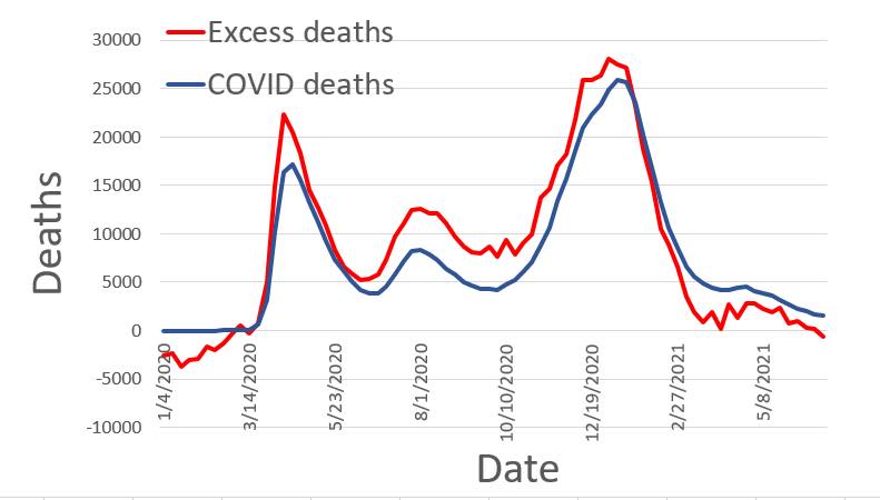 Even more significantly, the blue line in Figure 1 shows “COVID deaths” as recorded by the CDC during the same time period. The two plots are remarkably similar. Indeed, if anything, based on this graph, the CDC appears to undercount COVID deaths. Again, this is precisely what we’d expect if what the CDC labelled as “COVID deaths” did actually correspond to deaths caused by COVID. Anyone skeptical of this conclusion has to provide a plausible alternative explanation for why more than half a million Americans died over the last 18 months in waves that corresponded exactly to surges in COVID cases.