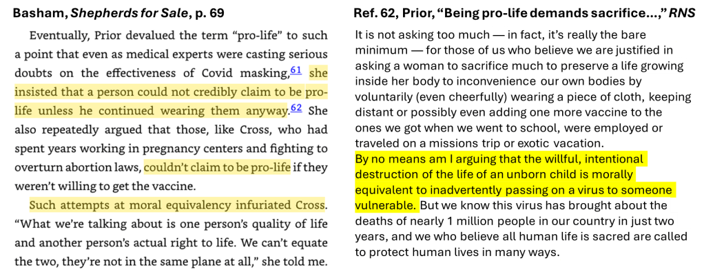First, in Chapter 3 “Hijacking the Pro-Life Movement,” Basham worries that all kinds of progressive causes are being annexed to the pro-life cause, thereby diluting it. I share this concern. For example, pro-life evangelical literature professor Karen Swallow Prior posted irate and rightly-criticized Tweets lambasting pro-lifers for their failure to support COVID protocols. However, in chapter 3, Basham cites a 2022 RNS article by Prior and makes several claims about it. First, she writes that Prior “insisted that a person could not credibly claim to be pro-life unless he continued wearing [masks]” and that she “repeatedly argued that [pro-life activists] couldn’t claim to be pro-life if they weren’t willing to get the vaccine.” Then she characterized Prior’s reasoning as an attempt at “moral equivalency” (p. 69).