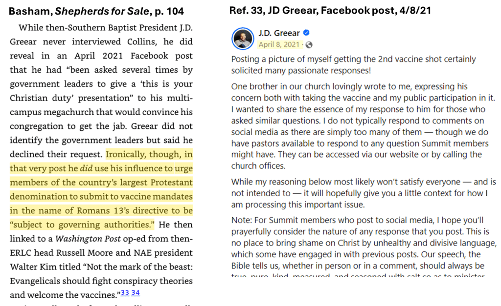 There are a number of problems with this claim, but I will only mention the most important one: the post in question was not about vaccine mandates. Greear repeatedly stated in the post that “there is certainly room in the body of Christ for believers to disagree [over the vaccine],” that the decision to not get the vaccine is “a matter of judgment and conscience,” and that it is not “a first order issue of faith.” He then explained how his own personal decision to get the vaccine was based on his belief that it is generally wise to “defer” to the government’s “counsel” and “recommendation.” In other words, he was not talking about a command from the government, but advice. Most importantly, however, Greear’s post was made on April 8, 2021. and federal mandates were not put in place until five months later as Basham herself affirms (p. 110). Thus, Greear could not possibly have been talking about “vaccine mandates” in his post, as Basham claims.