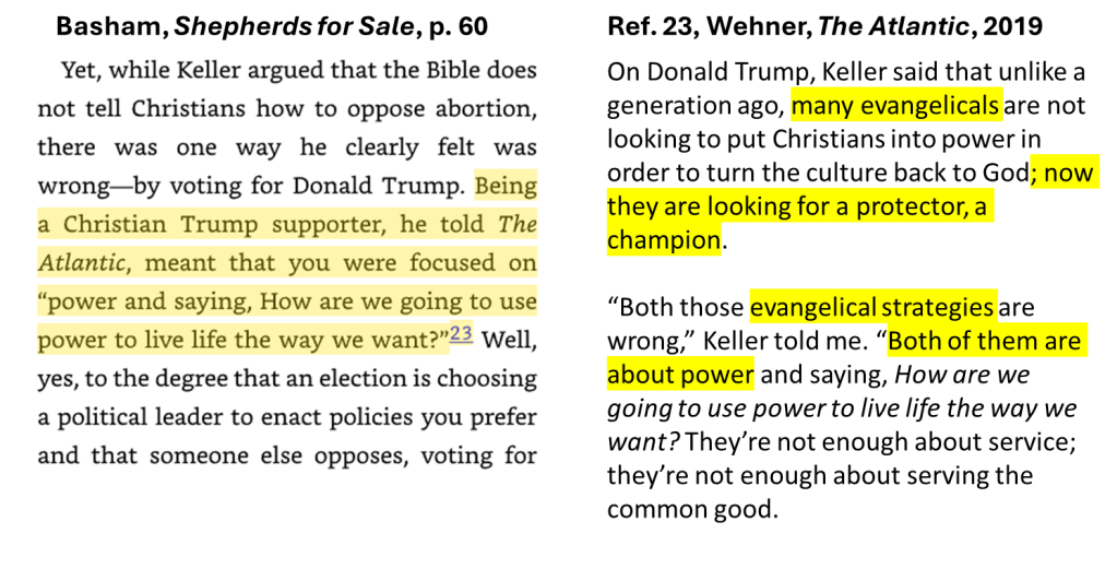 Finally, on p. 60, Basham claims that Tim Keller “clearly felt” that voting for Donald Trump was wrong and that “Being a Christian Trump supporter… meant that you were focused on ‘power and saying, How are we going to use power to live life the way we want?'[23]”
