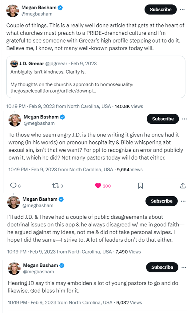 Or consider Basham’s claim that after the Supreme Court struck down Roe vs. Wade, “many of the big-name evangelical leaders who were supposed to represent pro-life activists… sounded distinctly less than celebratory” (p.52). She names Russell Moore, Beth Moore, Karen Swallow Prior, and Mika Edmonson as those who offered problematic responses. But what about other members of “#BigEva”? Brent Leatherwood, J.D. Greear, Gavin Ortlund, and The Gospel Coalition all immediately posted celebratory tweets or articles. Again, I’m not disagreeing that some evangelical responses were muted or underwhelming (although I think the criticism of Prior’s NYTimes article is arguable). Instead, I’m pointing out that, with so many characters within the orbit of #BigEva, it’s easy to craft whatever narrative we want.