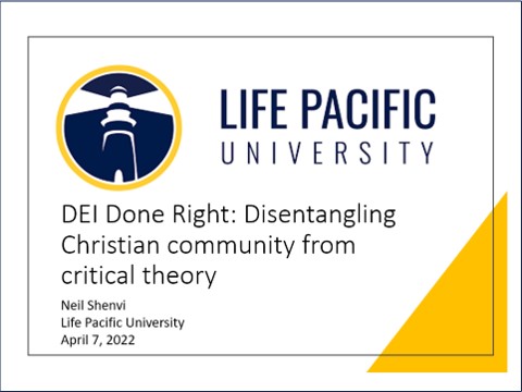 Now, since Marcus invited me and since he’s the director of Diversity, Equity, and Inclusion at Life Pacific University, I have about ten seconds to turn this talk around before he shuts off my mic and cuts the video, right? Yeah, maybe. But hear me out. My claim is that while most DEI programs are rooted in critical theory, we can think about these concepts in ways that are compatible with Christianity. In other words, we can see our churches, universities, and institutions as places where diversity, equity, and inclusion can be fostered provided that we define these terms in a biblical way and explicitly reject definitions rooted in critical theory. My aim here today is to show you how to do that.