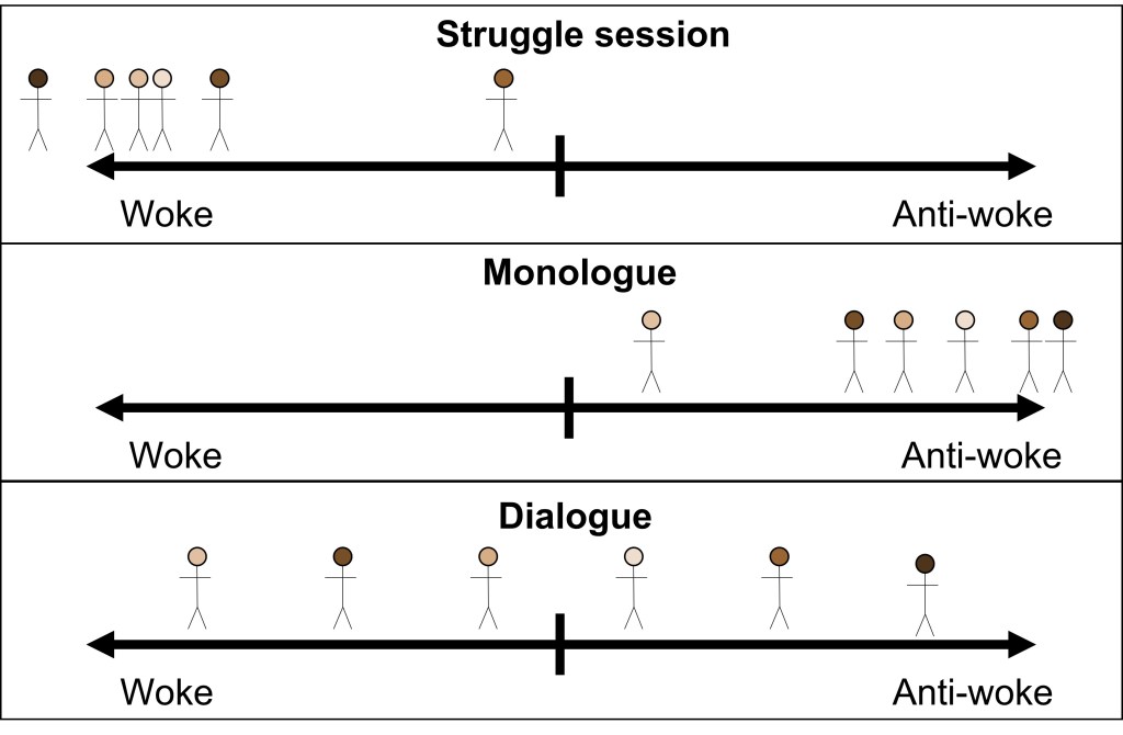 Here’s what too many churches and institutions and corporations do. You get six people on a panel whose views range from ultra-woke to moderately woke and say: “Look, here’s our diverse panel on race in America. Look how we’re fostering open dialogue.” You are not fostering dialogue. You are having a struggle session.