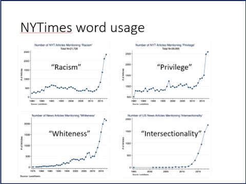 Let’s start with some data, since I’m a scientist and I love data. Here’s a chart of word usage frequency from the NYTimes. Around 2014, you can see the beginning of an event which some cultural commentators have dubbed “The Great Awokening.” Words like “racism” “privilege” “whiteness” and “intersectionality” suddenly exploded all over the pages of the NYTimes.