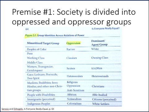 The “social binary” is the claim that society can be divided into dominant, oppressor groups and subordinate, oppressed groups along lines of race, class, gender, sexuality, and a host of other factors. Here are Sensoy and DiAngelo in their book Is Everyone Really Equal?: “For every social group, there is an opposite group… the primary groups that we name here are: race, class, gender, sexuality, ability status/exceptionality, religion, and nationality.” Consequently, “sexism, racism, classism, and heterosexism are specific forms of oppression.”