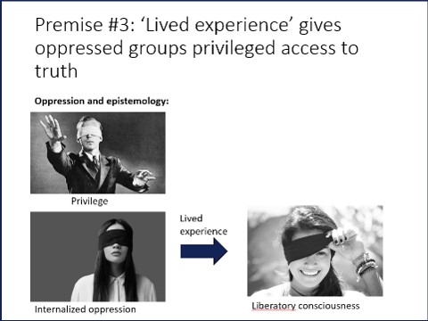 Third: lived experience. Contemporary critical theory argues that “lived experience” gives oppressed people special access to truths about their oppression