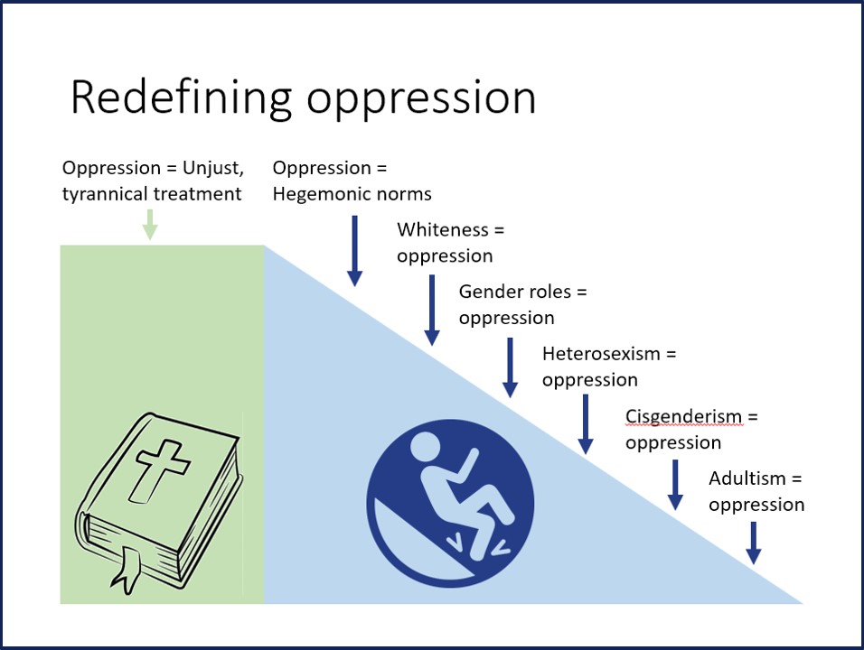 I spent a lot of time on this section, because Christians seem to still think they can adopt critical theory’s redefinition of the word “oppression” and yet only apply it to racism. That simply isn’t true. Biblically speaking (and according to most dictionaries), “oppression” refers to violence, cruel treatment, unjust control, and tyranny. It does not refer to “socially dominant groups imposing their values on culture.” If you adopt critical theory’s definition, you’ll have to apply it consistently to all socially dominant groups, whether whites, men, heterosexuals, Christians, or cisgendered people. And you’ll have to commit to dismantling not just whiteness, but patriarchy, heteronormativity, the gender binary, ableism and a host of other purported systemic oppressions. “Inclusion” in DEI initiatives will demand that you include not just people of different races and ethnicities, but people who emphatically reject a biblical sexual ethic. Again, that’s not something Christians can embrace. So we have to reject critical theory’s redefinition of “oppression” at the very outset.