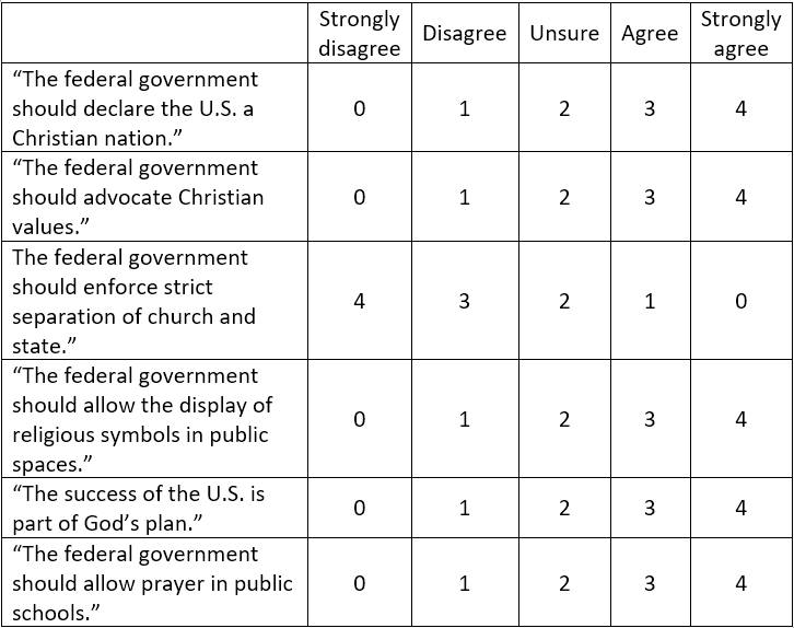 Second, because of how responses were scored, a person who marked “unsure” for all six questions, would receive a total score of 12, and would consequently be classified as an “Accommodator” who is “supportive” of Christian nationalism. That doesn’t make much sense.