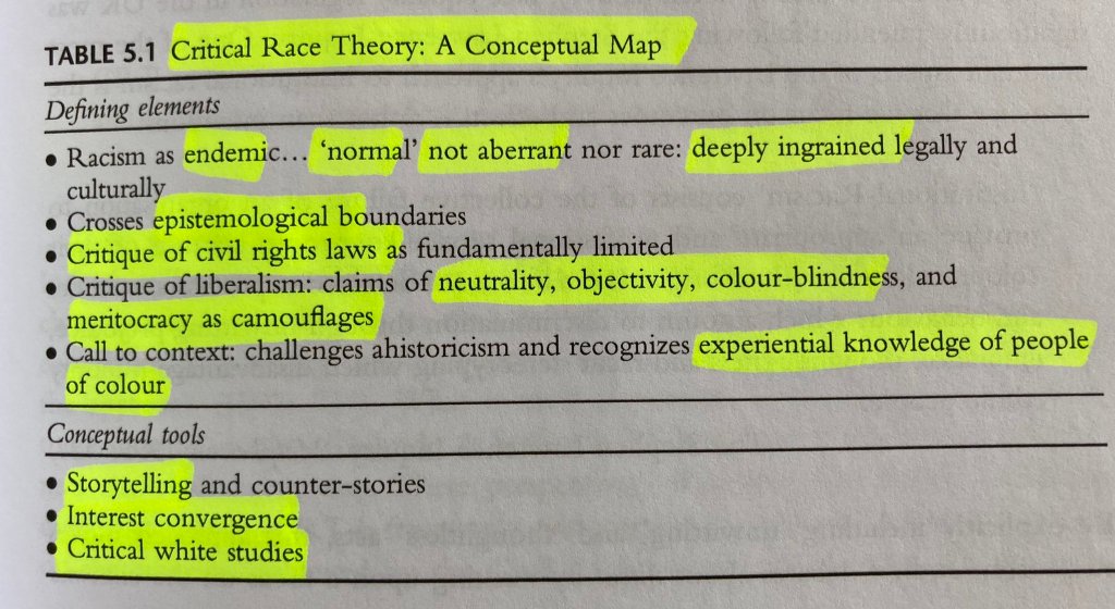 “CRT’s criticisms of meritocracy, and related notions such as objectivity and colour-blindness, are not a rejection of them in principle but a criticism of their raced effects in practice. It is simply and demonstrably the case that these notions, despite their apparent concern for equity and justice, operate as a mechanism by which particular groups are excluded from the mainstream… For example… deeply conservative and regressive perspectives frequently masquerade as a concern for ‘objectivity’, ‘neutrality’ and ‘standards of evidence’.” (p. 100)