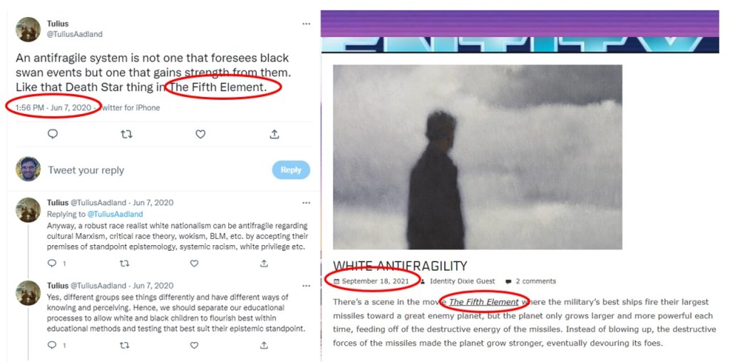 Aadland’s Tweets about “White antifragility” were posted on June 7, 2020. However, the Identity Dixie article was posted on Sept. 18, 2021, over a year later. The arguments in the Tweets and the article are identical. Moreover, both the Tweets and the article begin with an unusual reference to the movie The Fifth Element. Consequently, either 1) Achord and Aadland were the same person who wrote both the Tweets and the article, or 2) Achord had plagiarized the article from the Aadland account despite claiming to not have known about the existence of the Aadland account. In either case, Achord was lying.