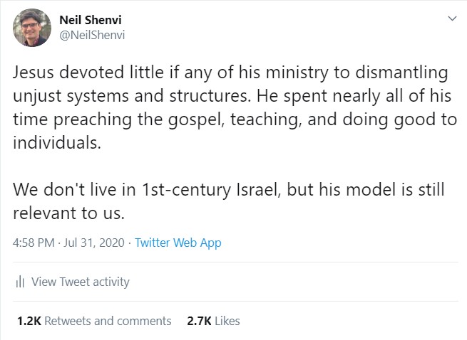 But, from this perspective, it’s much harder to argue that Jesus was focused on “dismantling unjust systems and structures.” He did not engage in sustained political activism, affirmed paying taxes to oppressive Roman authorities (Mat. 22:15-22), refused political power (Jn. 6:15), and insisted that his kingdom was not of this world (Jn. 18:36). While Jesus’ teaching did correctly inspire his followers to seek justice and did eventually transform the world, that kind of indirect action over the course of centuries is simply not what activists have in mind when they use this phrase.